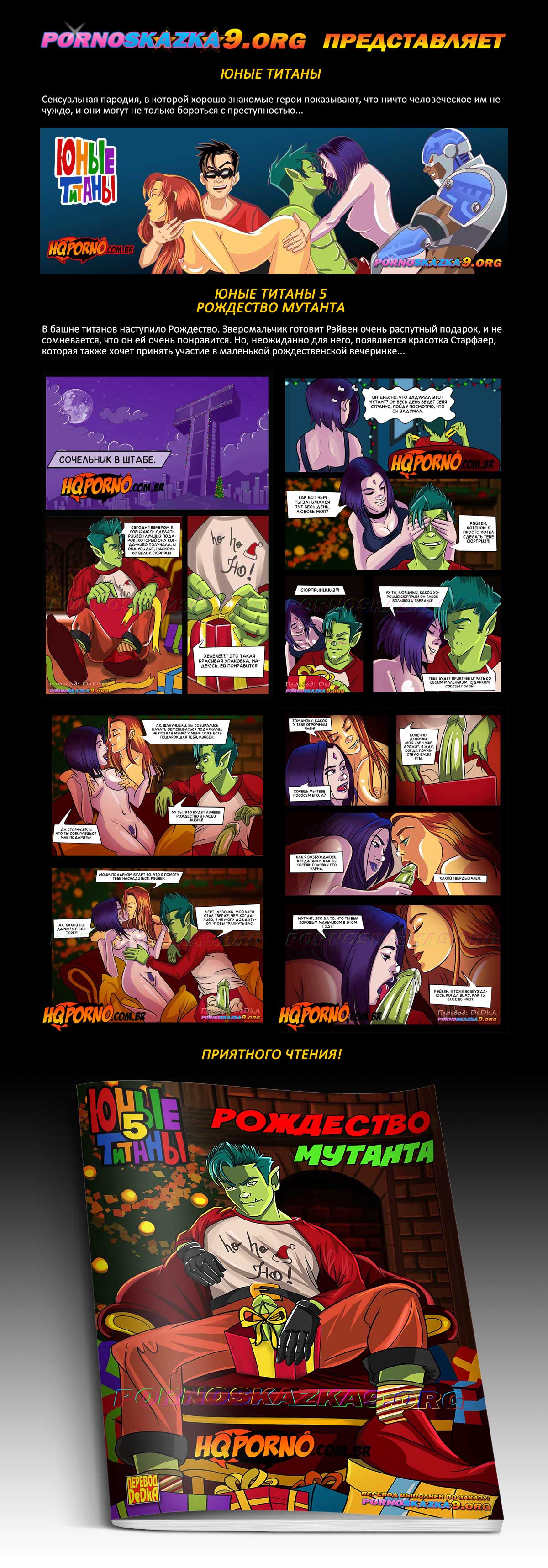 Порно комикс «Юные Титаны. Часть 5. Рождество мутанта.» В башне титанов наступило Рождество. Зверомальчик готовит Рэйвен очень распутный подарок, и не сомневается, что он ей очень понравится. Но, неожиданно для него, появляется красотка Старфаер, которая также хочет принять участие в маленькой рождественской вечеринке…